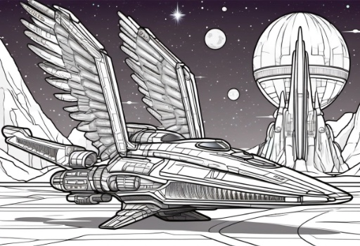 Futuristic retro punk spaceship with large wings, an ice planet is in the background. coloring book style